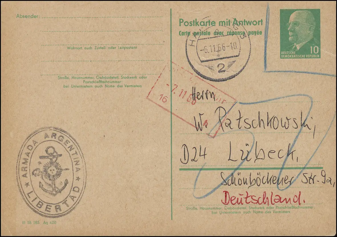 sur la carte postale réponse DDR P 73 A vers Lubeck - avec postporto (écrite à la main), arrière: coupe de journal sur le départ du voilier de Hambourg pour le voyage de Brest N° de catalogue: P73A Vérification: original Référence produit: 00000000026364>p>Remarque: Cet article n'est disponible qu'une seule fois. Vous recevrez exactement l'article illustré.