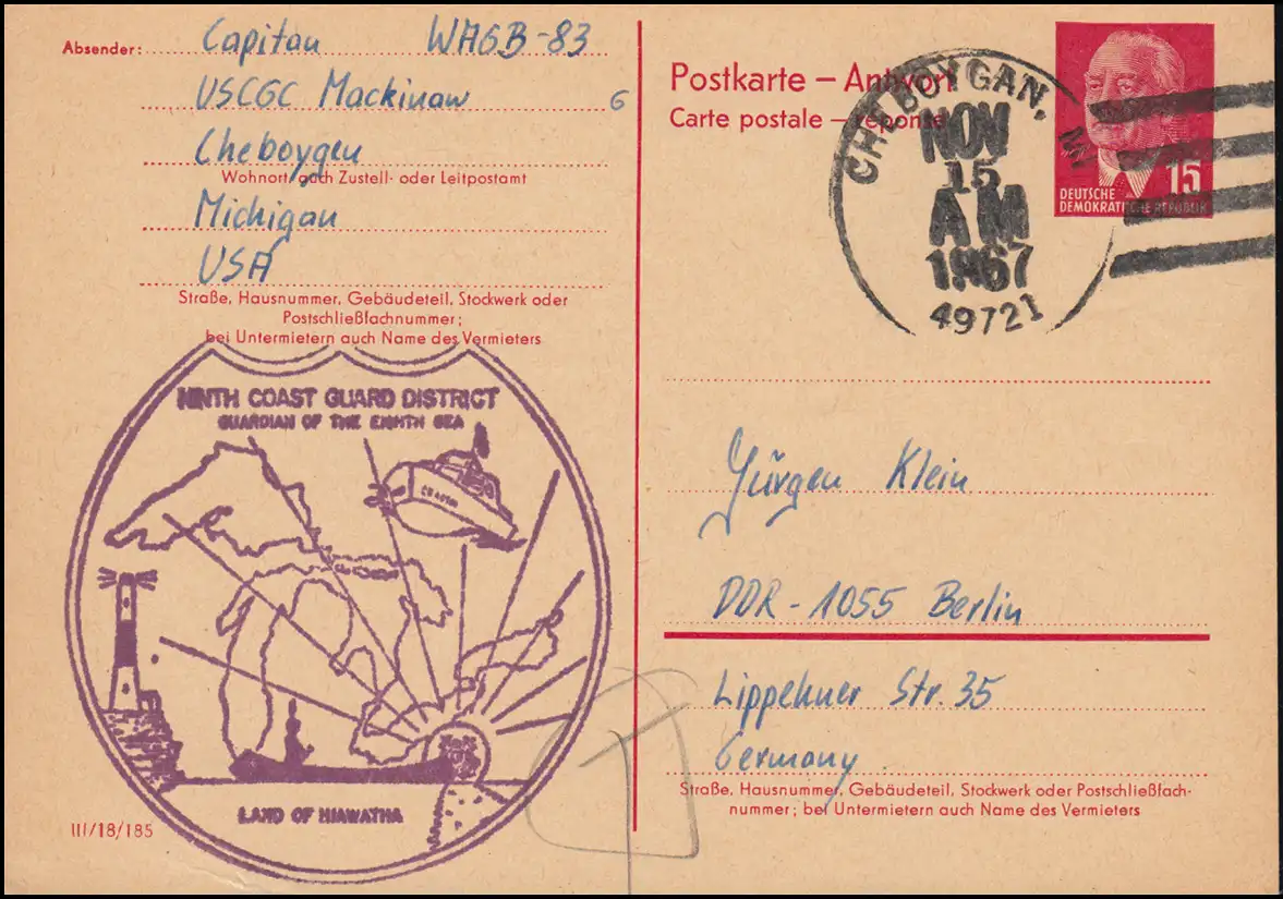 Carte de réponse DDR P 65aA avec cachet CHEBOGAN M. 49721 - 15.11.1967 et cachet de bord du brise-glace SU USCGC Mackinaw (WAGB-83), couru vers Berlin / RDA N° de catalogue: P65a A Vérification: original Numéro d'article: 00000000031375>p>Remarque: Cet article n'est disponible qu'une seule fois. Vous recevrez exactement l'élément représenté.