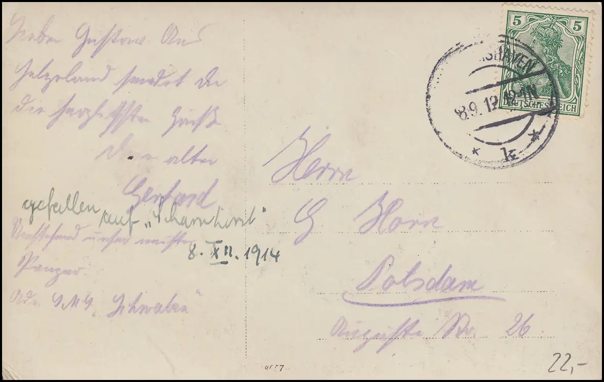 Poste de bateau de SMS Schwaben, WILHELMSHAVEN EF 8.9.1912 sur AK SMs Kaiser