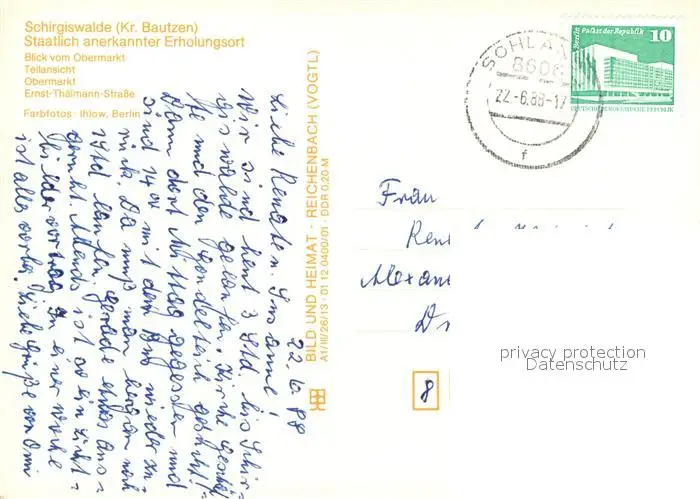 Schirgiswalde Blick vom Obermarkt Teilansicht Ernst Thaelmann Strasse Schirgiswalde postalisch gelaufen 1988 Erhaltung siehe scans [WerneD78] WernPID7