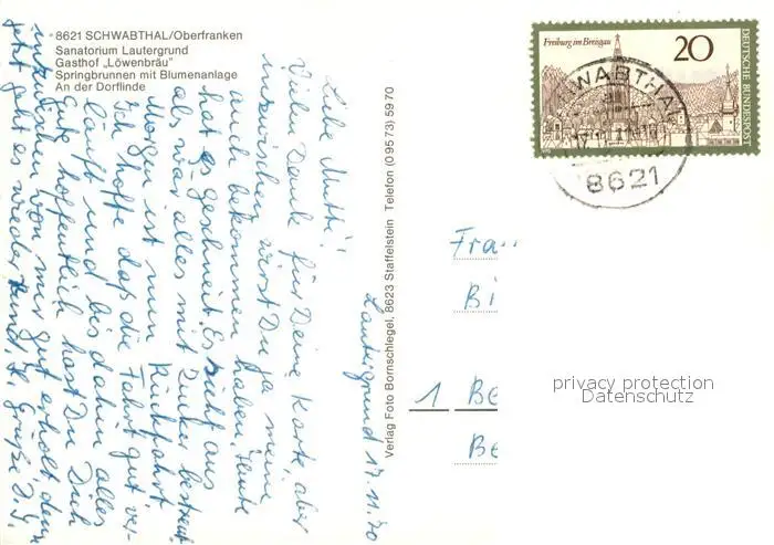 Schwabthal Sanatorium Lautergrund Gasthof Loewenbraeu Springbrunnen mit Blumenanlage Dorflinde Schwabthal postalisch gelaufen 1970 Erhaltung siehe scans [WerneD78] WernPID7