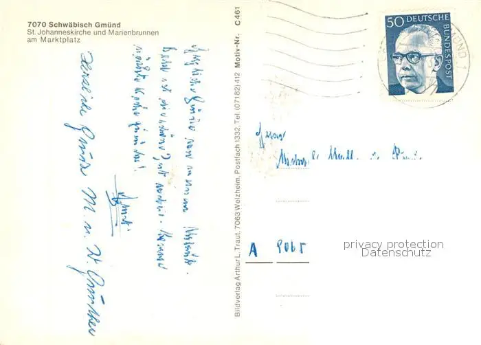 Schwaebisch_Gmuend St Johanneskirche und Marienbrunnen am Marktplatz Schwaebisch Gmuend postalisch gelaufen nach 1965 Erhaltung siehe scans [WerneD78] WernPID7