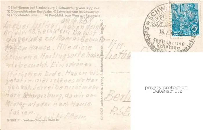 Schwarzburg_Thueringer_Wald Steilklippen Schwarzburg Trippstein Oberweissbacher Bergbahn Schweizerhaus Trippsteinhaeuschen Weg zur Fasanerie Schwarzburg_Thueringer postalisch gelaufen 1958 Erhaltung siehe scans [WerneD78] WernPID7