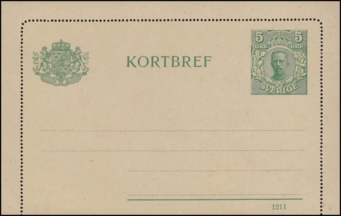 Suède Cartes de crédit K 9 KORTBREF Roi Gustav 5 Öre Date d'impression 1211, **