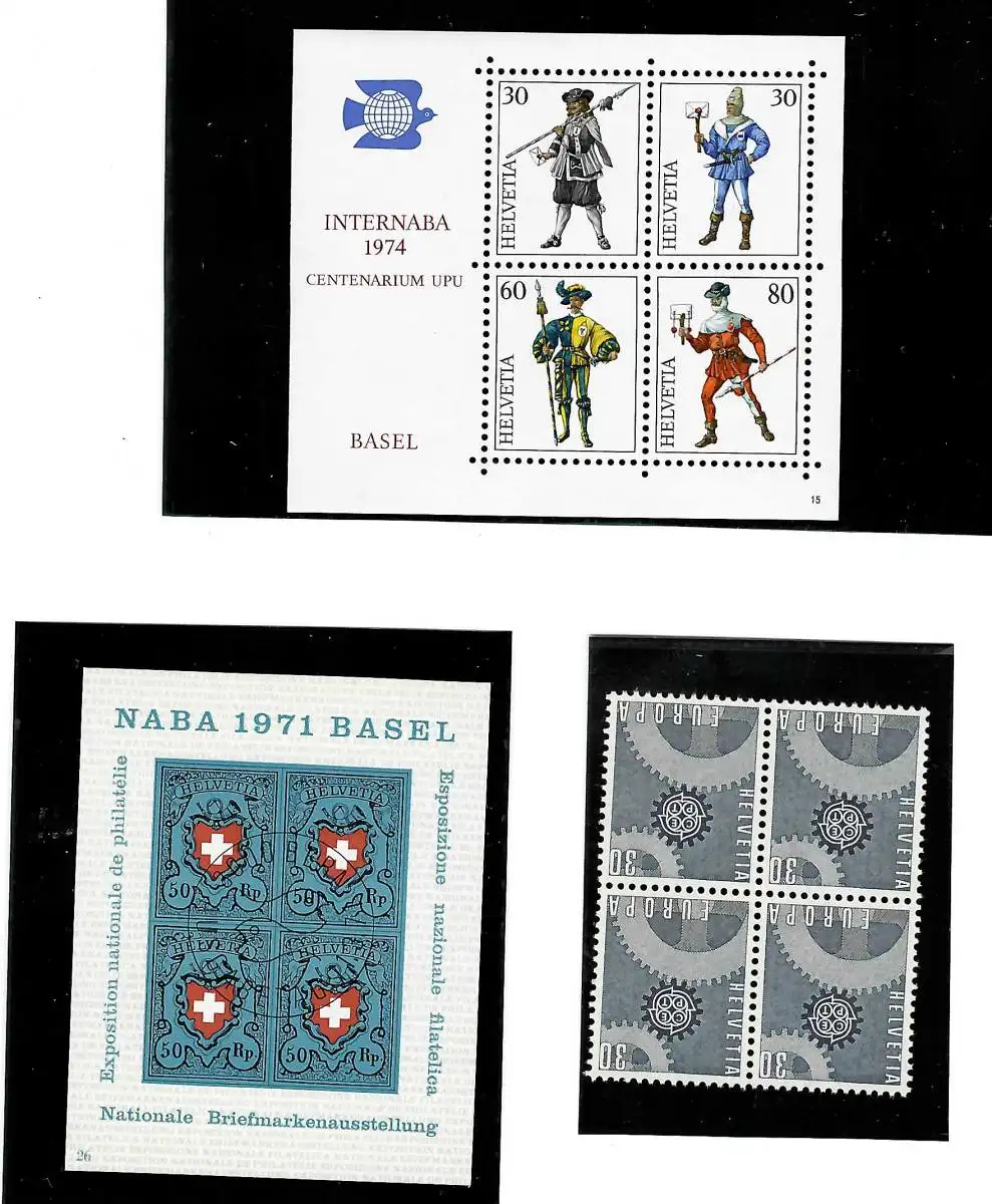 Schweiz: 1x Block 1974, 1x Block 1971 gestempelt, 1x Viererblock postfrisch