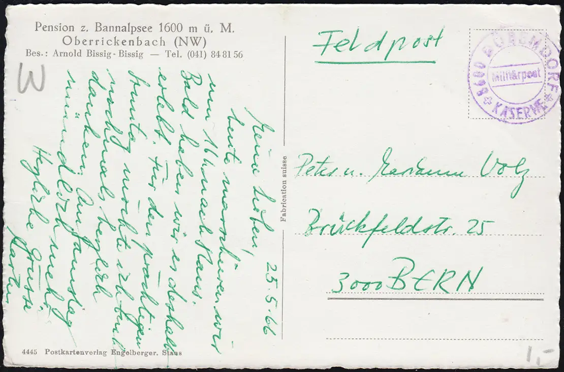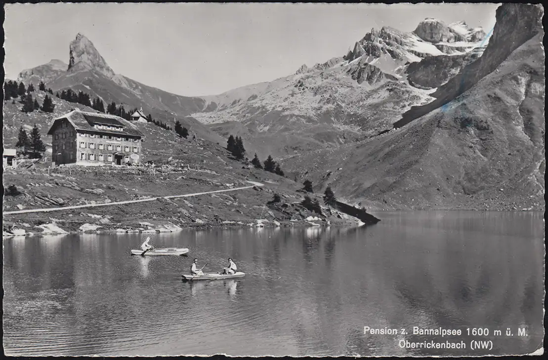 Carte postale Pension zum Bannalpsee 1600 m u. M. / Oberrickennach (NW) comme carte postale de champ après Berne Examen: original Référence produit: 00000000033762