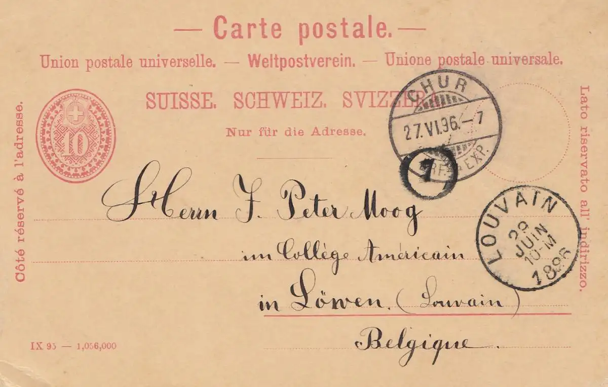 Suisse: Toute l'affaire: 1896: Chur vers Louvain/Belgique