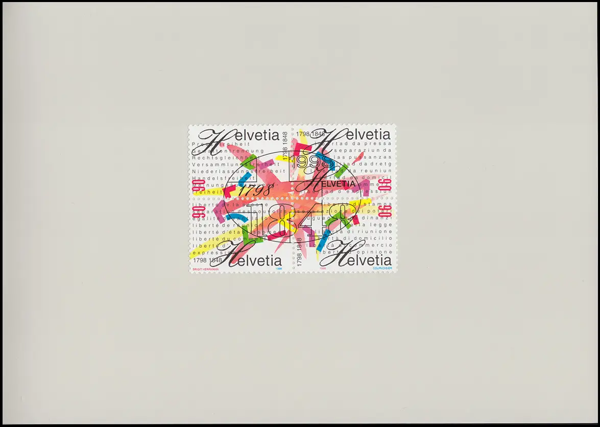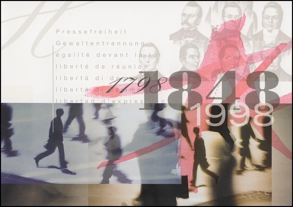Carte pliante 150 ans de l'État fédéral et 200 ans d'établissement de la République helvétique, imprimé en résumé avec un cachet spécial "1798 - 1848 - 1998," texte quadrilingue Numéro de catalogue: 1633-1636 Examen: original Numéro d ' article: 87900163351300