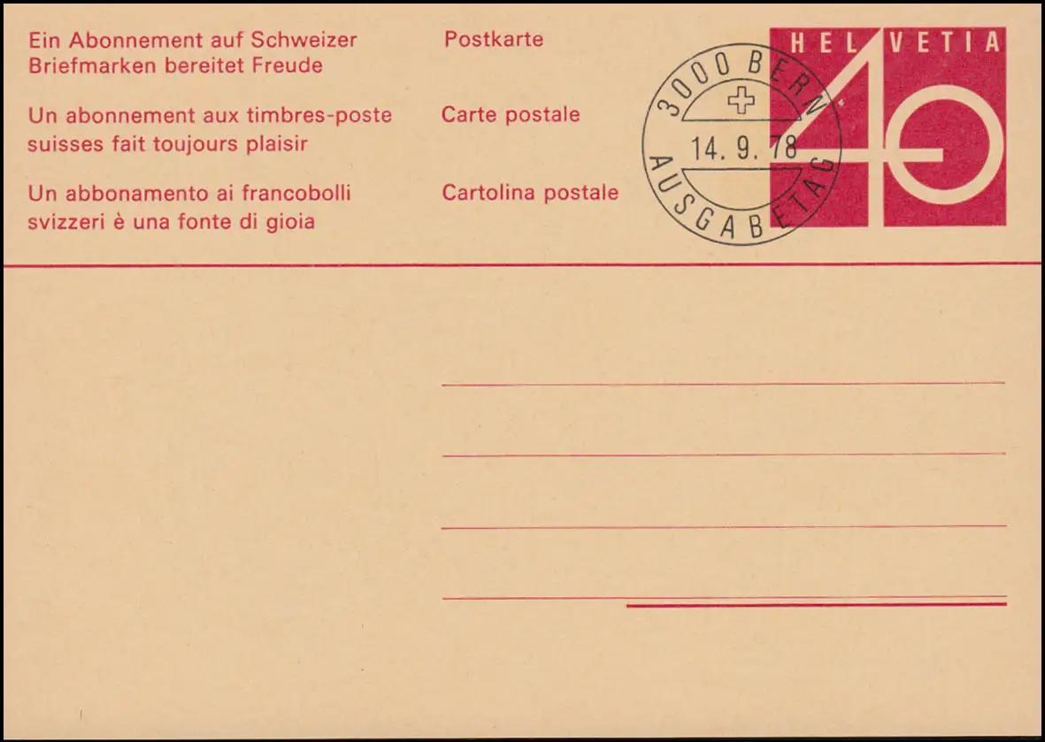 Suisse Carte postale P 238 Grand chiffre 40 rouge/jaune, ET-O BERN 14.9.1978