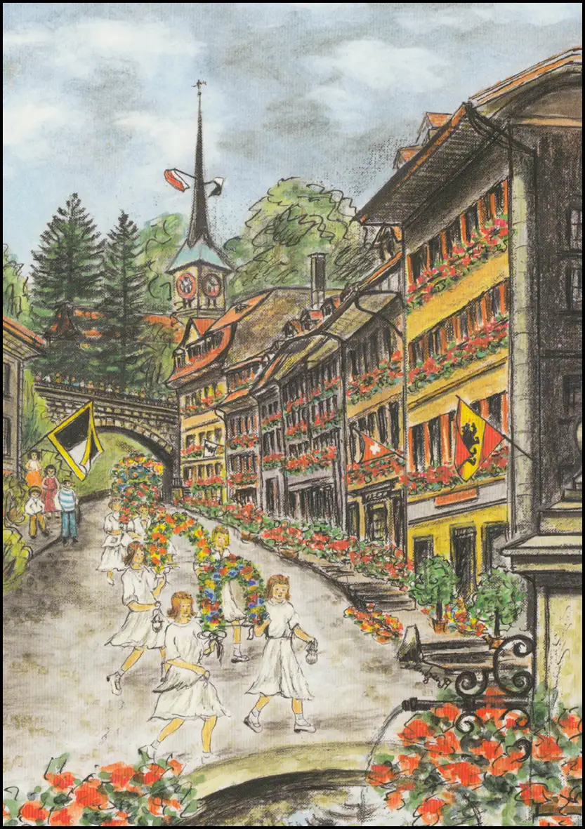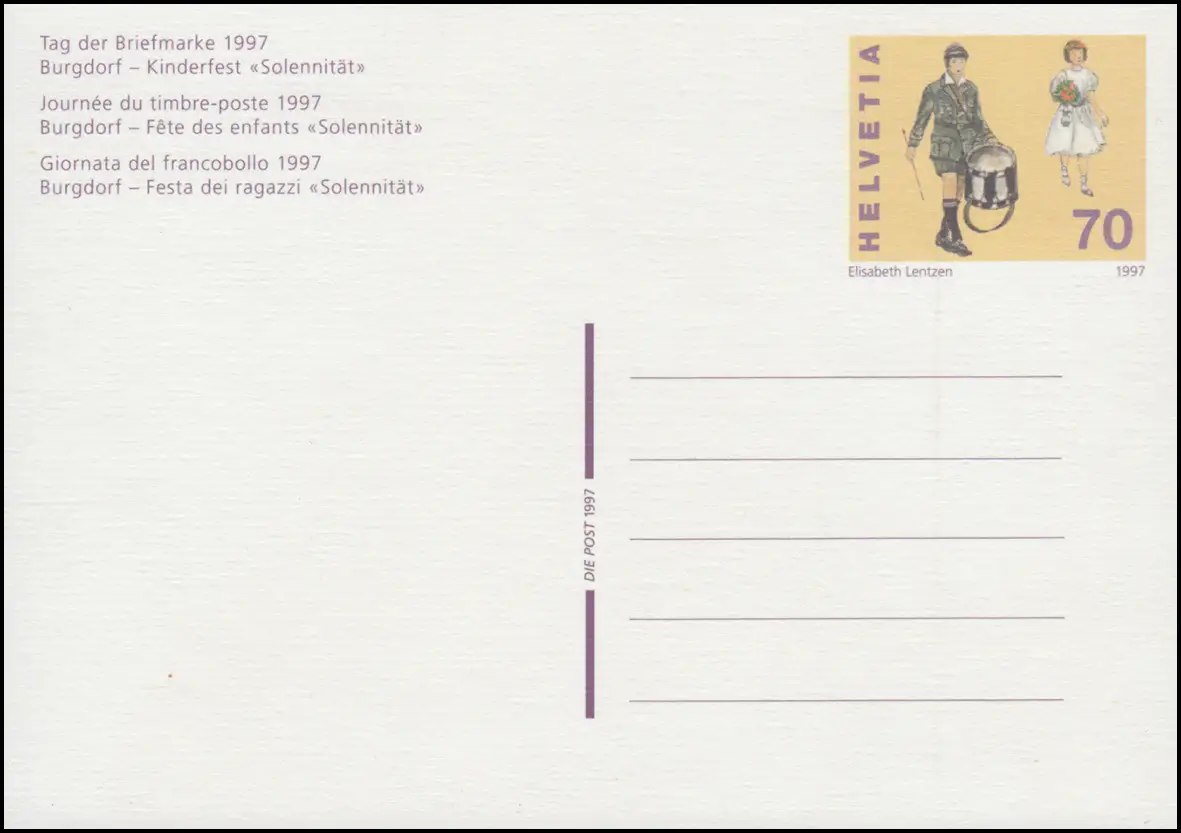 La Poste 1997: Journée du timbre / Burgdorf - Fête des enfants "Solennité" / Fig.: Déjeuner à Bburgdorf sur le chemin de la haute ville à la tapisserie pendant la solennité Numéro de catalogue: P258 Examen: original Numéro d'article: 87951025801100>p>Attention: Cet article est ou a été disponible plusieurs fois. La figure montre l'un de ces articles en un exemplaire. Cette marque fournie a uniquement les caractéristiques indiquées dans la description et peut donc différer de l ' image. Cependant, en particulier pour les marques marquées, nous nous efforçons de livrer l\'objet représenté. Si cela est une condition pour vous, veuillez nous le faire savoir.