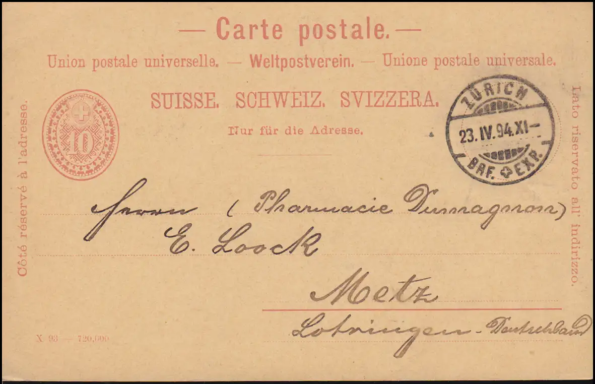 Suisse Carte postale P 29A avec DV X 93, ZÜRICH 23.4.1894 vers Metz / Lorraine