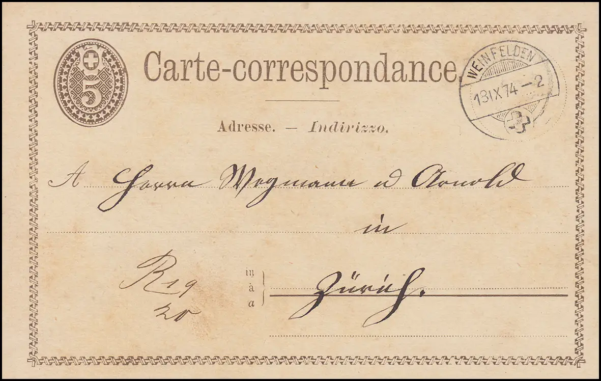 Suisse Carte postale P 5 chiffre avec blason 5 C brun WEINFELDEN 13.9.74 vers Zurich