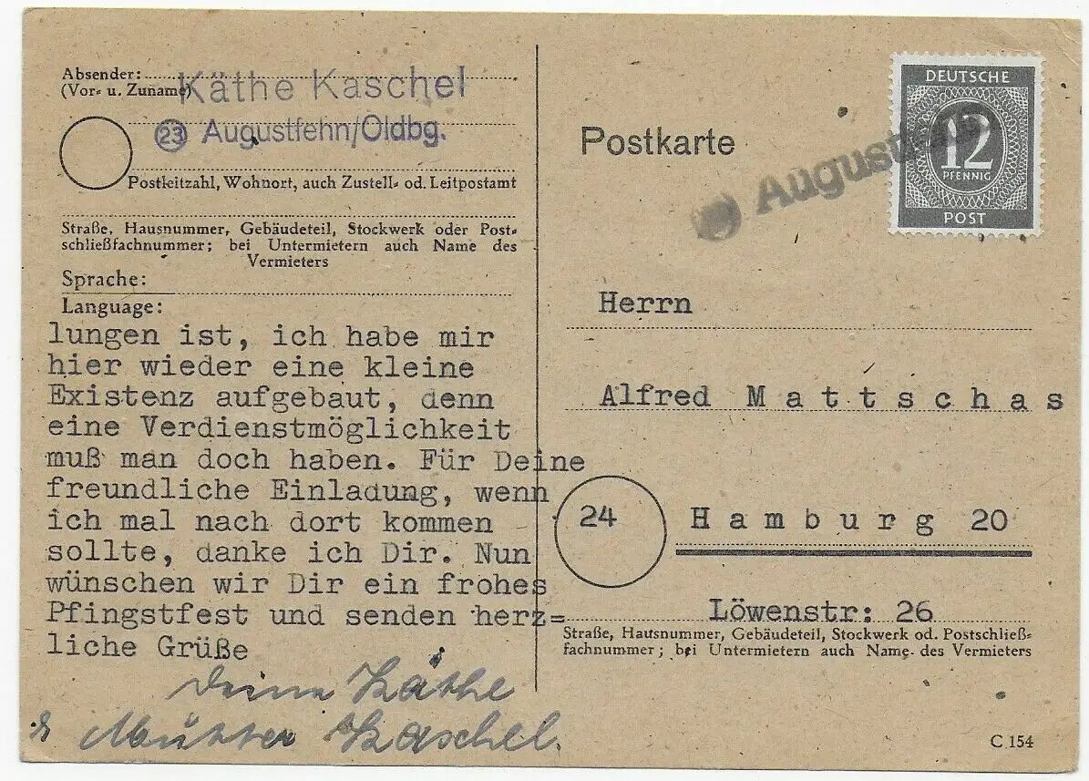Tampon d'avertissement rare 1947 Augustfehn/Oldenburg vers Hambourg