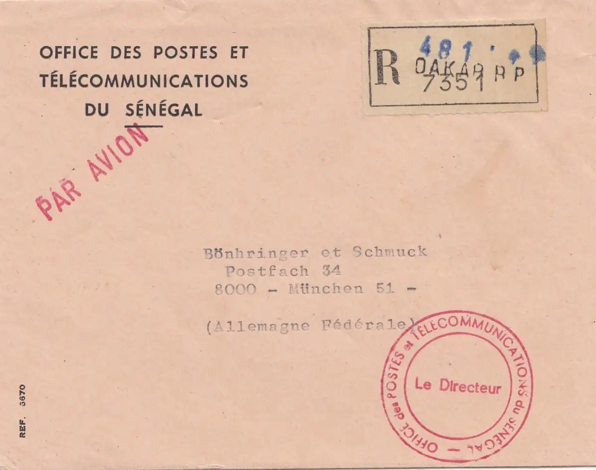 Sénégal: registreted Dakar Office des postes es Telecommunications, air mail