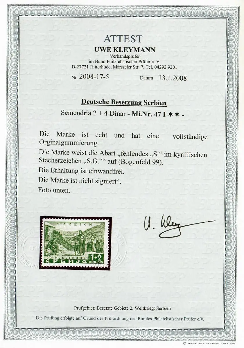 Serbie Min. 47 I, Abart, post-fraîchissement, ** BPP Attest