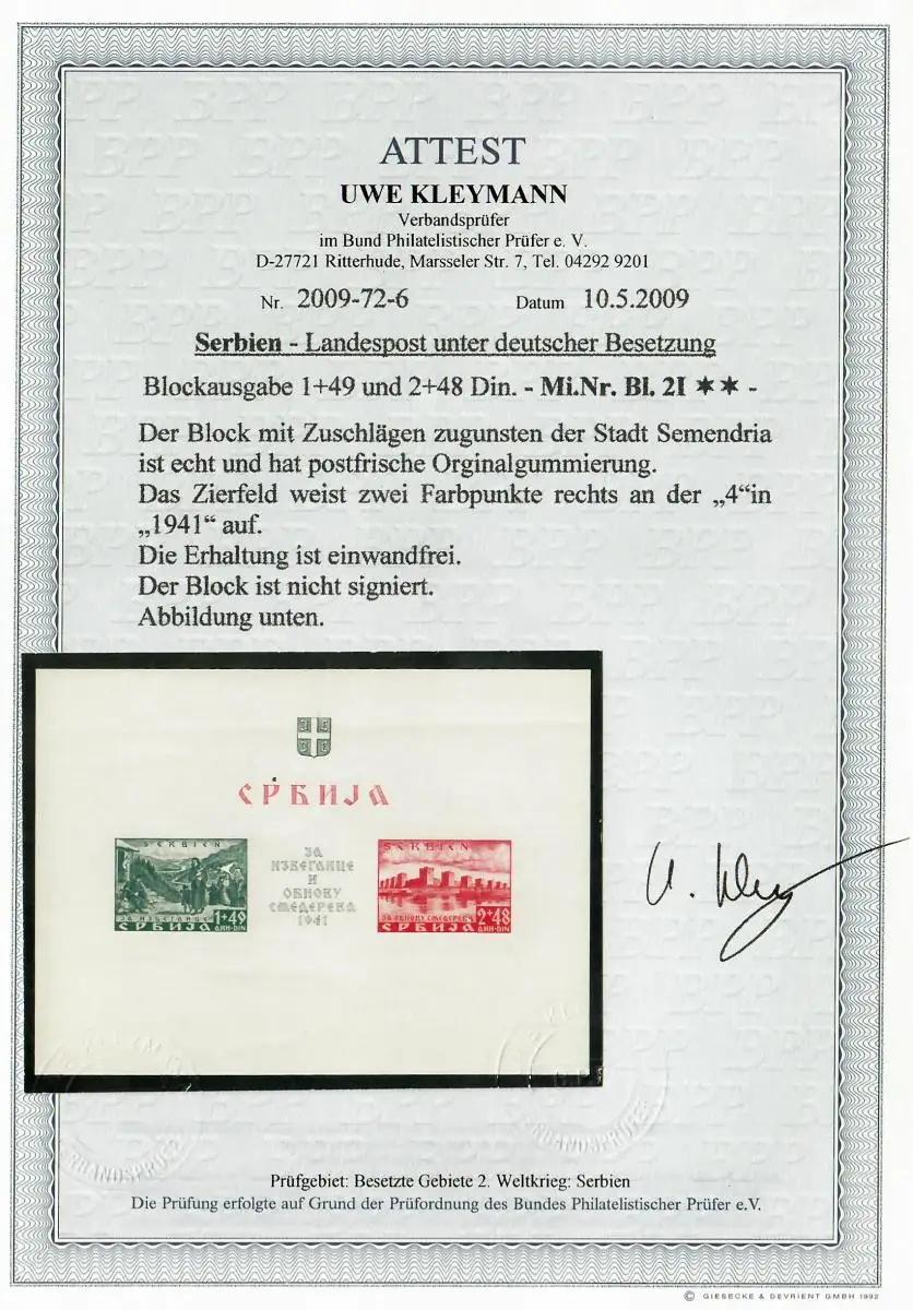 Serbie Min. Block 2 I, post-freease, **, pour la ville de Semendria, BPP Attest