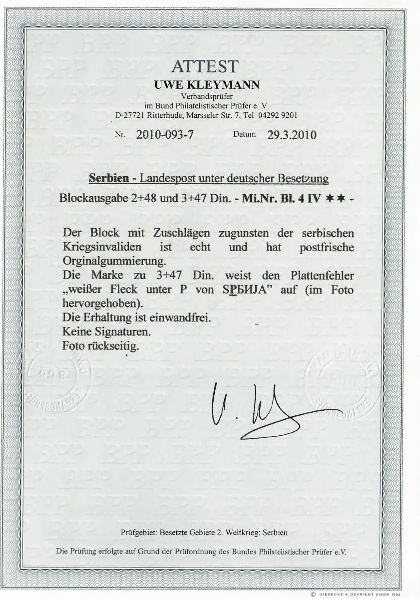 Serbie Min. Block 4 IV, post-frais,** Erreur de plaque, BPP certificat, invalidité de guerre