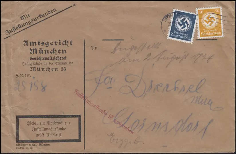 Service 133+143Imprime 4+50 Pf. MiF Cour administrative de dépôt MUNICH 31.7.34