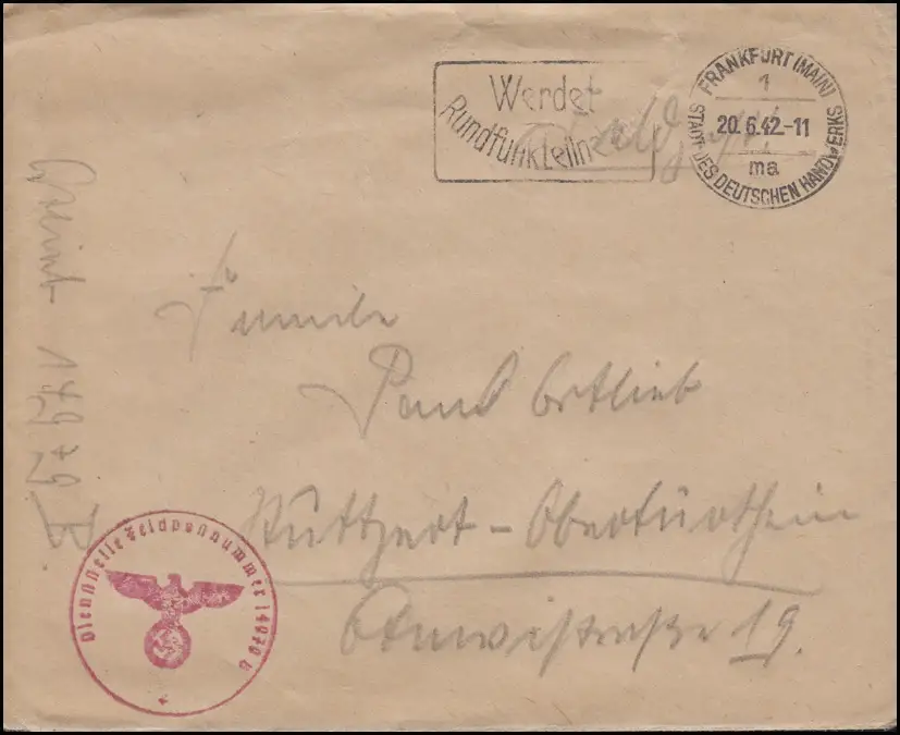 Service de poste de Feldpost 14970B de FRANKFURT / MAIN 1 ma - 20.6.42 vers Stuttgart