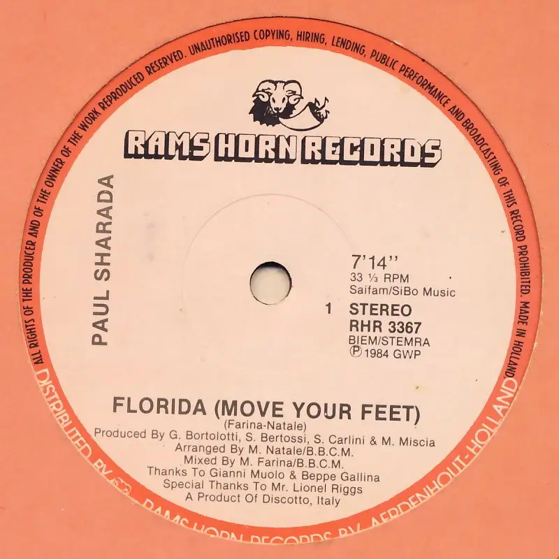 12" Maxi Paul Sharada - Florida Move Your Feet, Einheitscover der Plattenfirma; Bortolotti, Gianfranco, Mauro Farina, Mario Natale, Zustand Platte VG Hülle VG+; Made in Netherlands 1984 Rams Horn RHR 3367, Tracks 7:14, Instr. R.E.M.I.X. 5:15