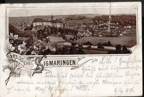 Sigmaringen. Gruss aus - Gelaufen 1897? Viele Risse und ein wenig zerknickt. (NPLZ 72488).