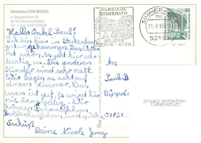 Simmerath Gaestehaus Don Bosco Simmerath postalisch gelaufen 1995 Erhaltung siehe scans [WerneD78] WernPID7