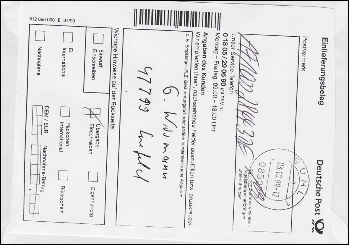 Enregistrer le porto de la page de port de l'ATM sur lettre de remise, cachet spécial Exposition des timbres Suhl 3.10.1999, label Premium avec croix préimprimée "Envoi-Rescription," reçu EPOS manuscrit Vérification: original Numéro d'article: 00000000047133>P>Remarque: Cet article n'est disponible qu'une seule fois. Vous recevrez exactement l ' article représenté.