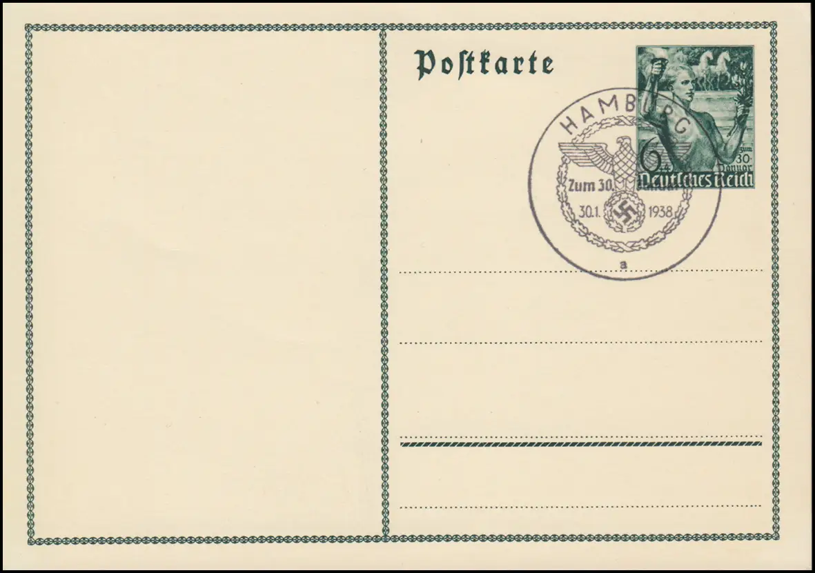 Carte postale spéciale P 267 anniversaire 1933-1938 avec SSt HAMBURG approprié 30.1.1938