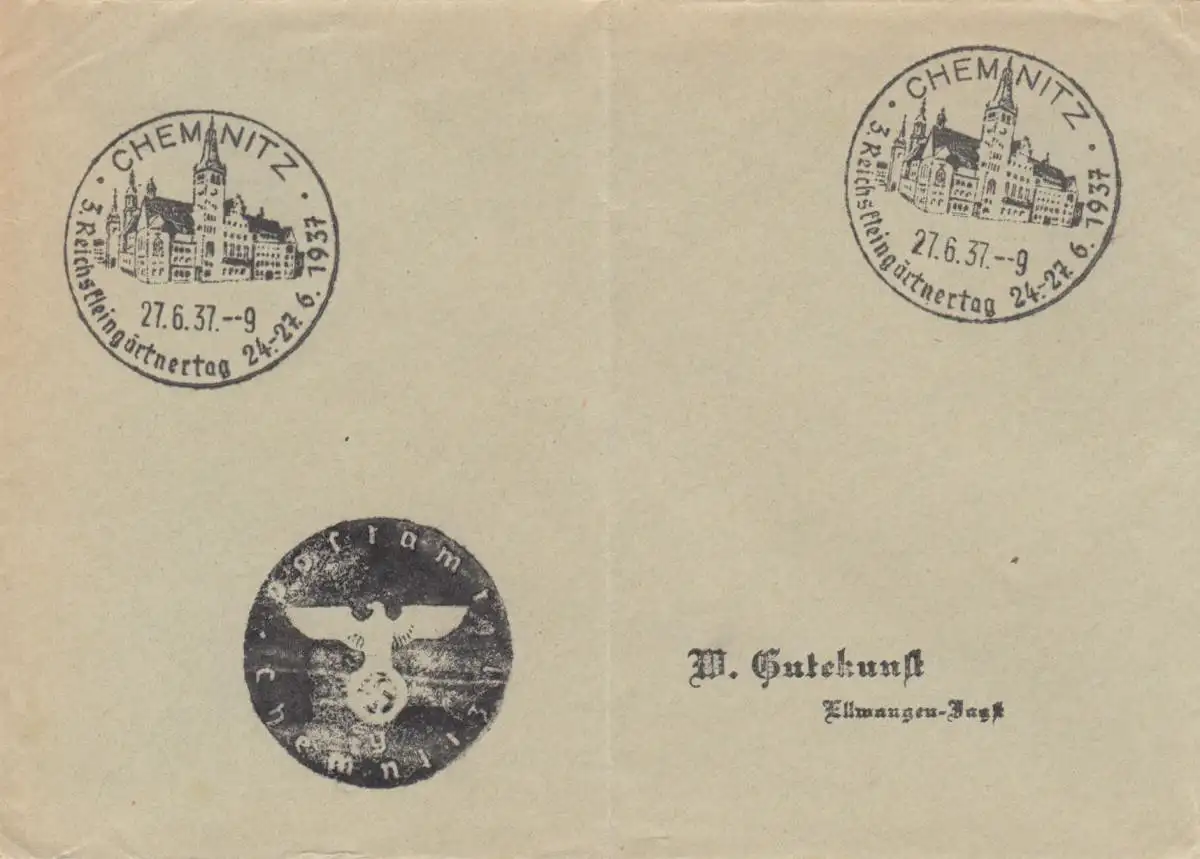 Tampon spécial 1937, Chemnitz, Reichskleingärtnertag, Temporaire négatif, Postschicht