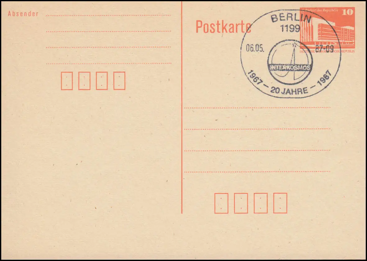 Timbre spécial BERLIN 20 ans INTERKOSMOS 6.5.1987 sur carte postale DDR P 86I