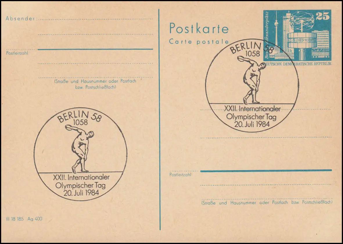 Tampon spécial Journée olympique Lanceur de Discussion 20.7.1984 sur carte postale DDR P 80