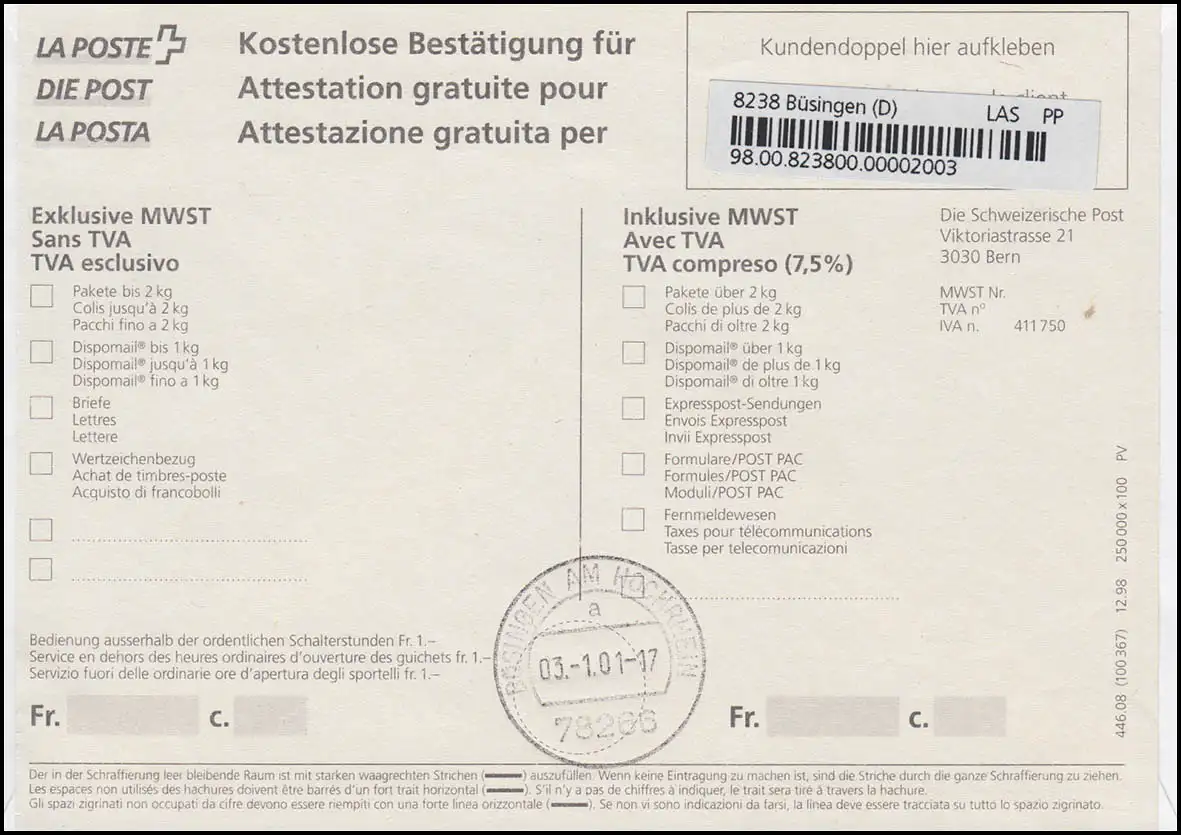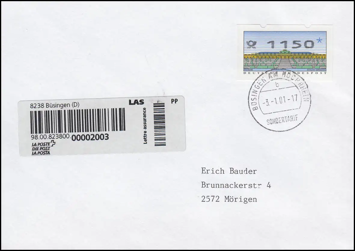 FDC d'inscription à l'état de porto de "BÜSINGEN SPÉCIALTARIF 3.1.01" selon Mortigen, Deutsche ATM-Frankatur 1150 Pfennig et Suisse-Schwerbs-Einschreibte-autocollant, bulletin d ' inscription avec cachet quotidien "78266 BÜsingen AM HOCHRHEIN 3.1/01 - 17" Numéro de catalogue: 2.2.3 Examen: original Numéro d\'article: 00000000014571>p>Remarque: Cet article n'est disponible qu'une seule fois. Vous recevrez exactement l\ \t article représenté.
