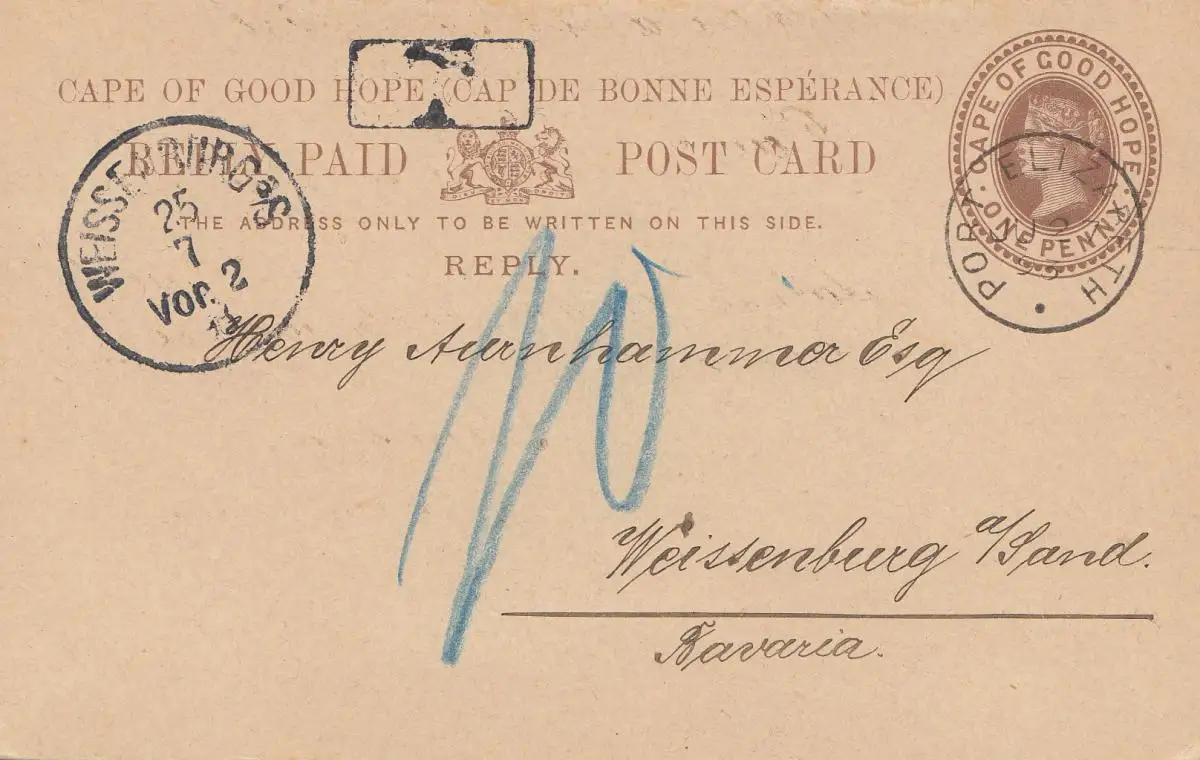 South Africa 1893: Post card Port Elizabeth to Weissenburg, Tax