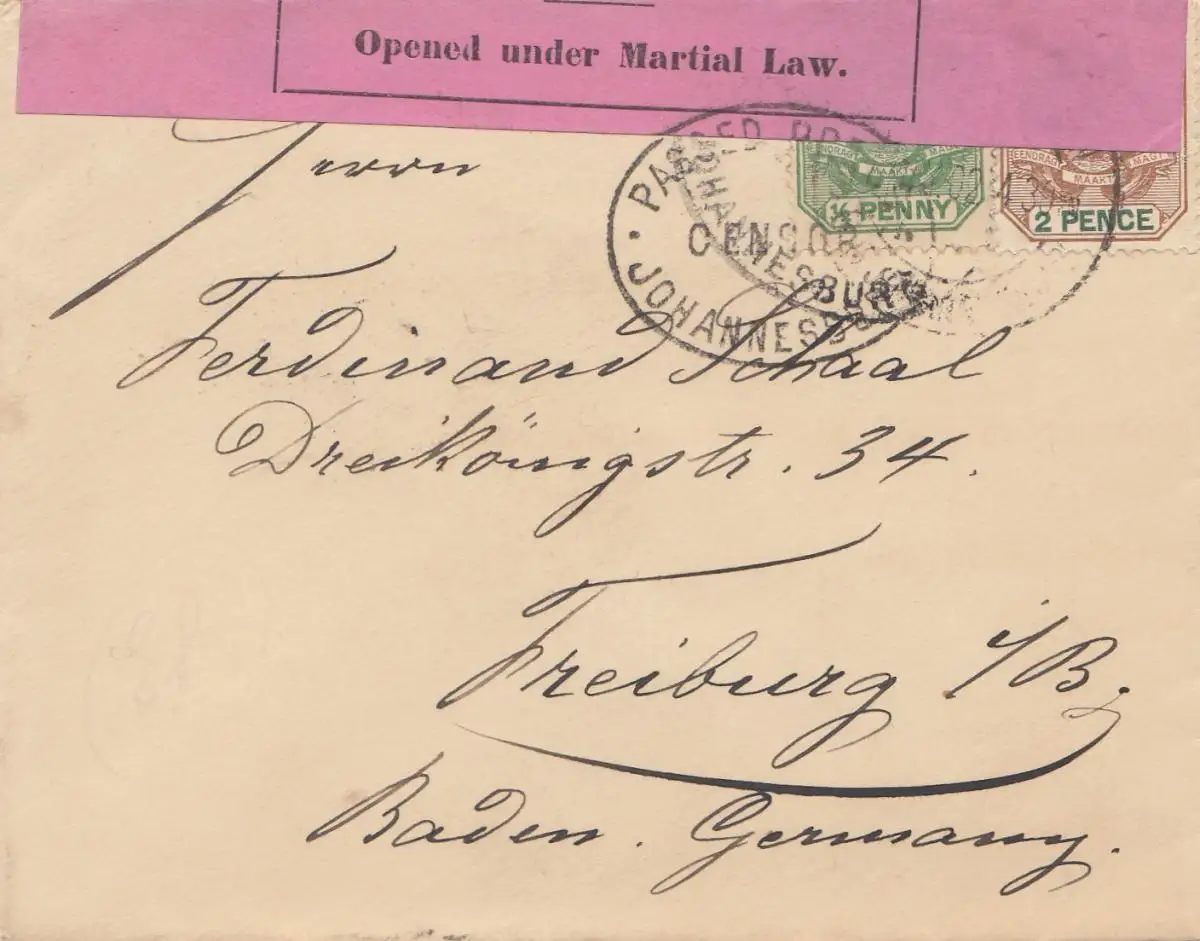 South Africa 1902 Johannesburg to Fribourg, opened under Martial law