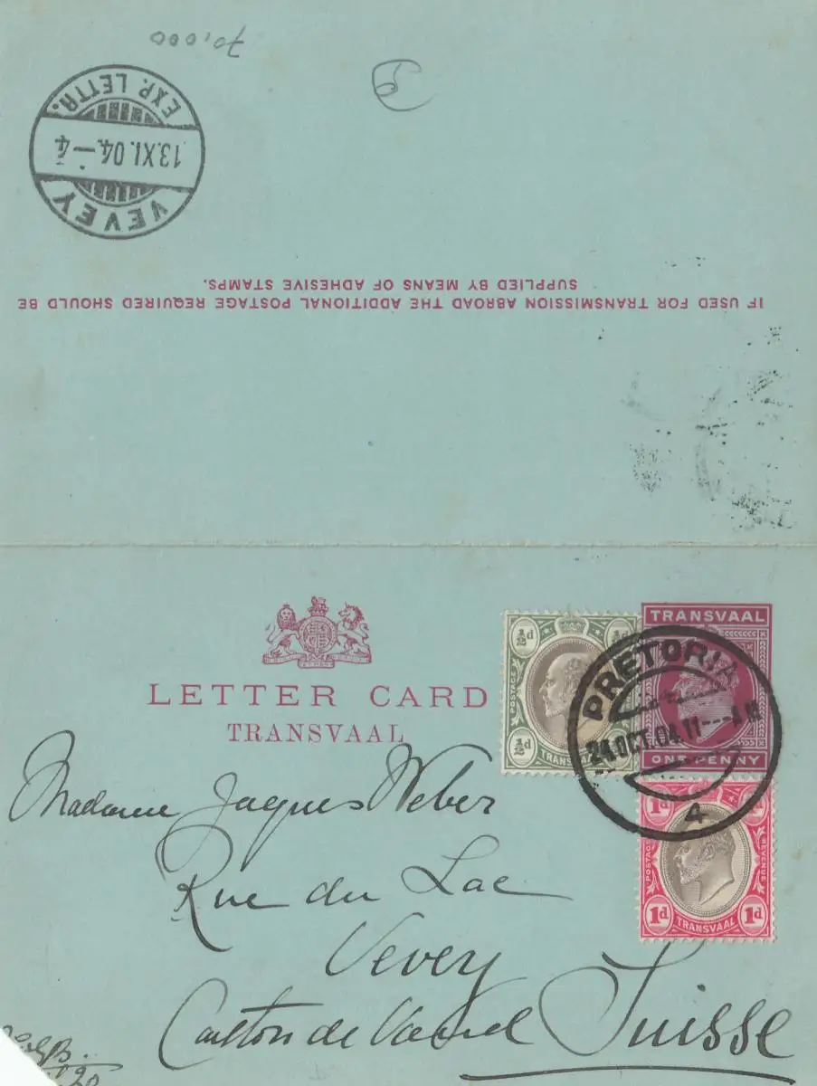 South Africa 1904 post card Pretoria to Vevey/Switzerland
