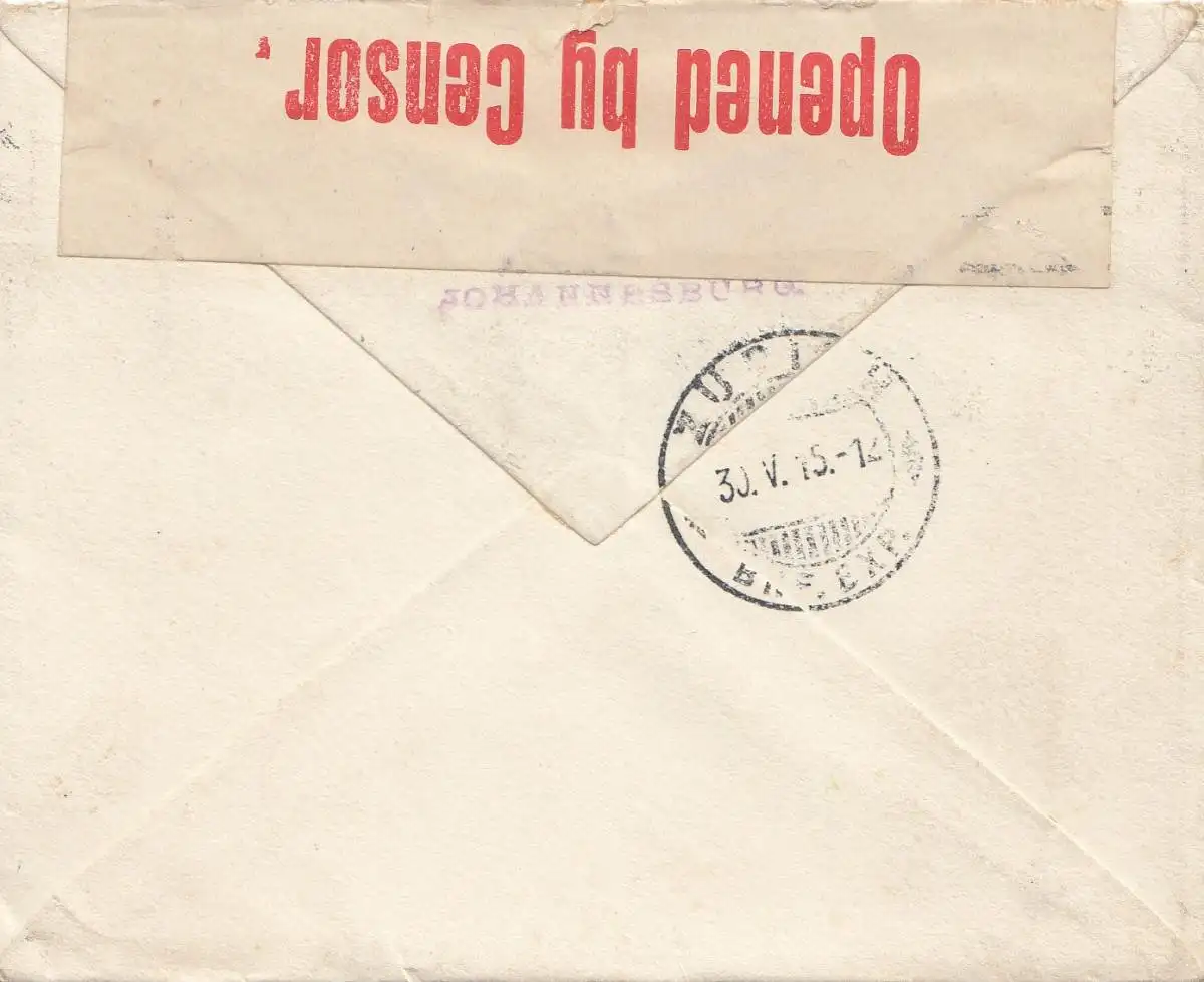 Afrique du Sud: 1915: Johannesburg to Zurich, Censor opened
