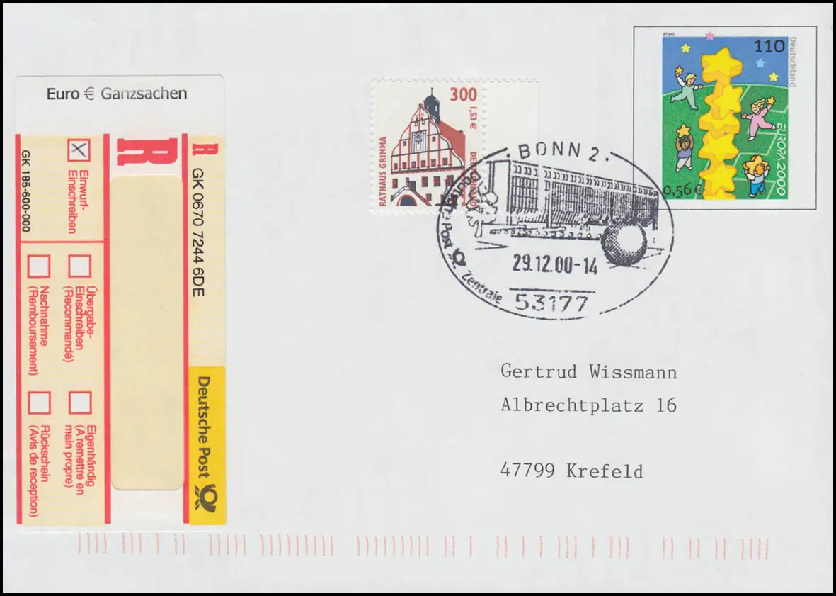 Lettre d'inscription spéciale "Euro € Glücksziel" avec SWK 2121 (1,53 Euro) à USo 19 (0,56 Euro), portofestlich (inscription à Krefeld), cachet spécial "BONN Deutsche Post Zentral 29.12.2000" Numéro de catalogue: USO9 Vérification: original Numéro d ' article: 00000000029794>p>Remarque: Cet article n'est disponible qu'une fois. Vous recevrez exactement l'article représenté.