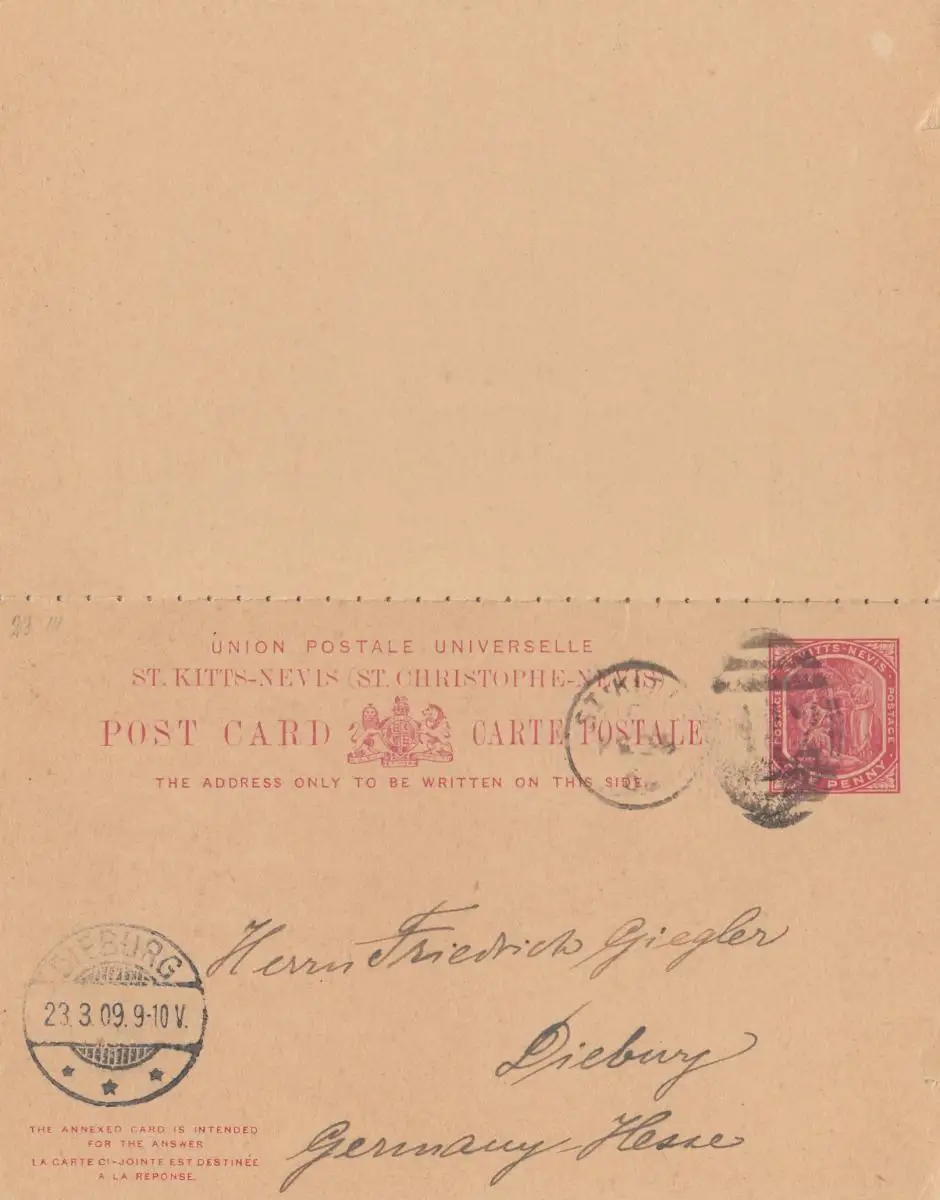 St. Kitts-Nevis: post card 1909 to Dieburg