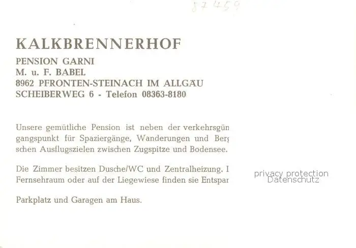 Steinach_Pfronten Kalkbrennerhof Hotel Pension Garni Hochalm Aggenstein Alpenrosen Alpvieh Alphornblaeser Bergbahn Steinach Pfronten postalisch nicht gelaufen nach 1965 Werbekarte (keine Postkarte) Erhaltung siehe scans [FriedD77] Werbekarte (keine Postkarte) Frierer