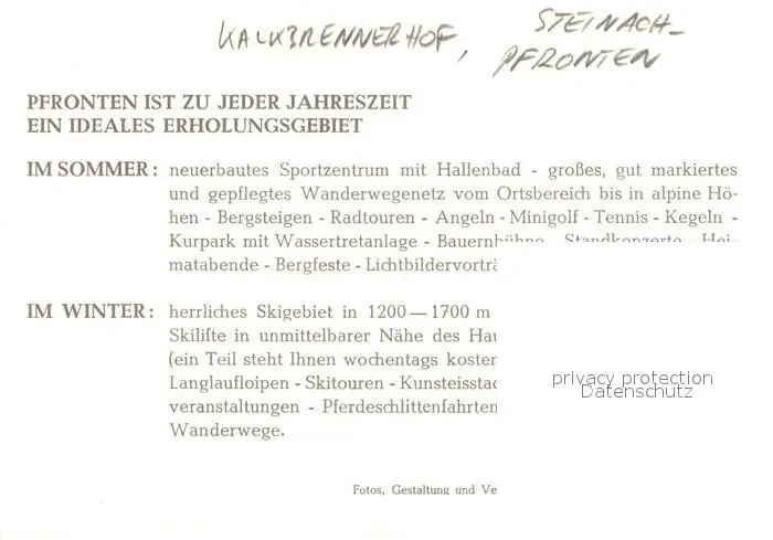 Steinach_Pfronten Kalkbrennerhof Hotel Restaurant Steinach Pfronten postalisch nicht gelaufen nach 1965 Werbekarte (keine Postkarte) Erhaltung siehe scans [FriedD77] Werbekarte (keine Postkarte) Frierer