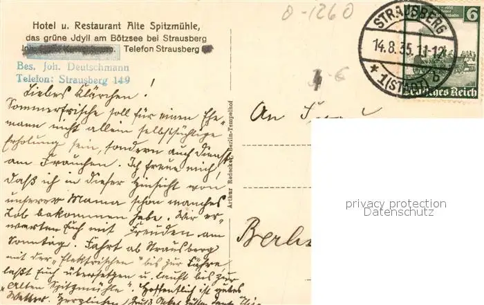 Strausberg_Brandenburg Hotel Restaurant Alte Spitzmuehle Strausberg Brandenburg postalisch gelaufen 1935 Erhaltung siehe scans [KathaD81] Kathoren
