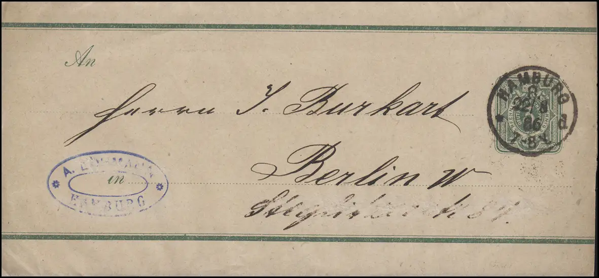 Bande passante S 7A chiffre 3 PFENNIG bleu-vert, HAMBURG 22.8.1886 vers Berlin