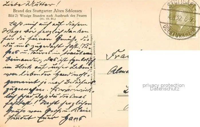 Stuttgart Brand des Stuttgarter alten Schlosses Stuttgart postalisch gelaufen 1932 Erhaltung siehe scans [LiesaD40] LiesID40