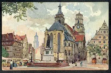 Stuttgart. Schillerdenkmal und Stiftskirche. - Gelaufen 1912?. (NPLZ 70000)