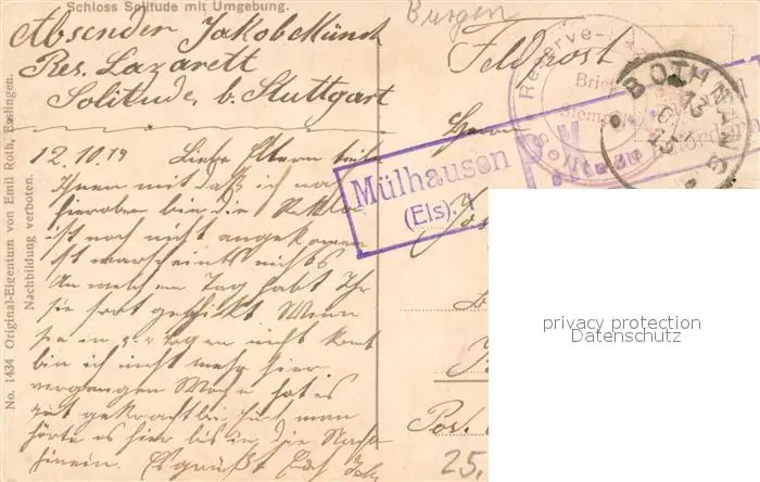 Stuttgart Schloss Solitude Gasthof Kurhaus Glemseck Stuttgart postalisch gelaufen 1915 Feldpost - Stempel Erhaltung siehe scans [FriedD77] Feldpost - Stempel Frierer