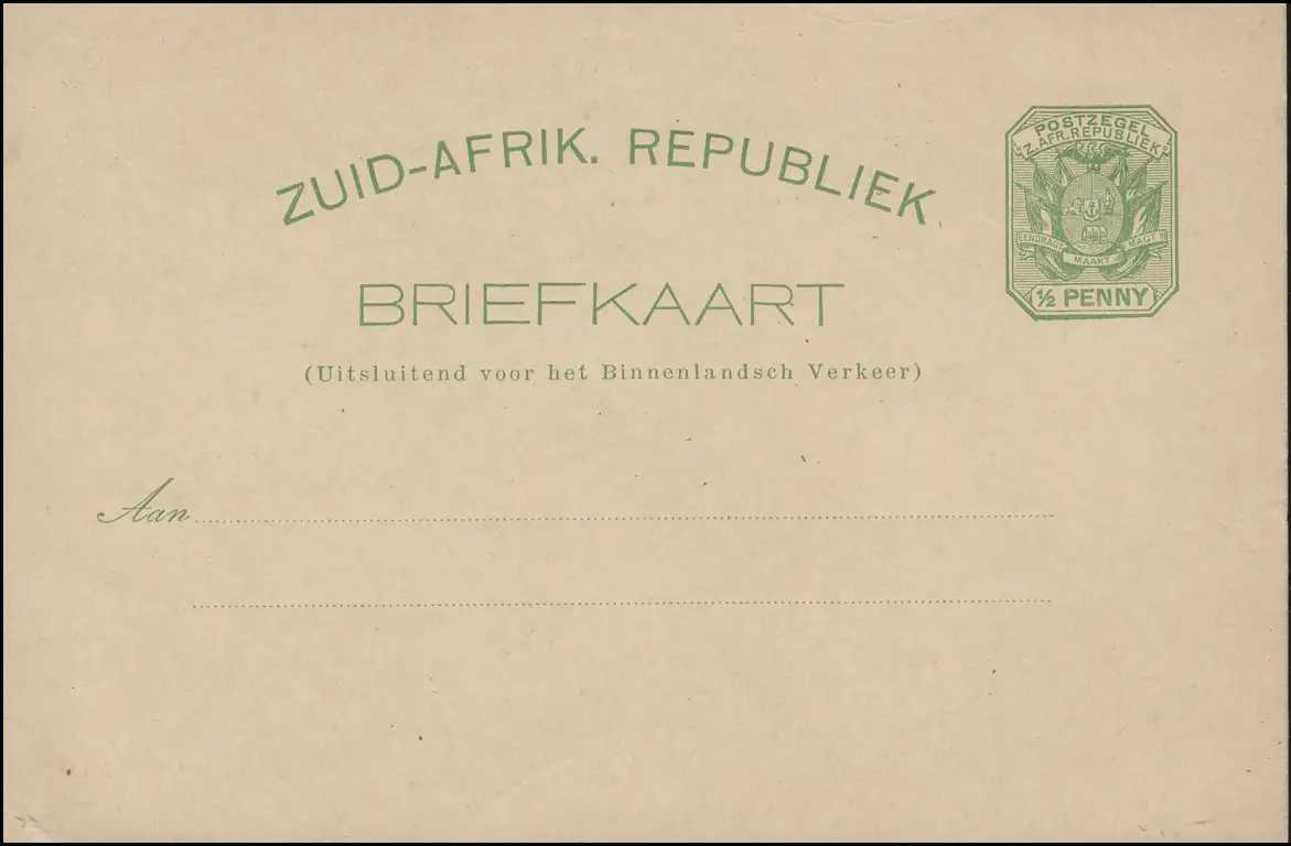 Afrique du Sud ZUID-AFRIQUE. REPUBLIEK BRIECKAART 1/2 Penny blasphème vert, non utilisé **