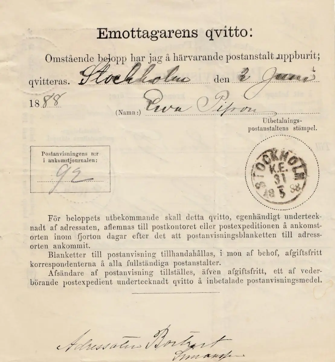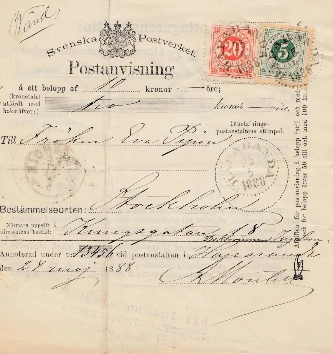 Suède: 1888: Postanvising Haparanda à Stockholm