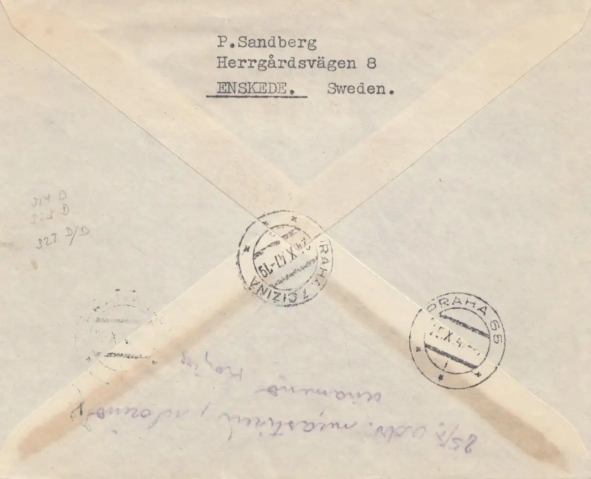 Suède: 1947: Lettre recommandé Stockholm à Prague, censure