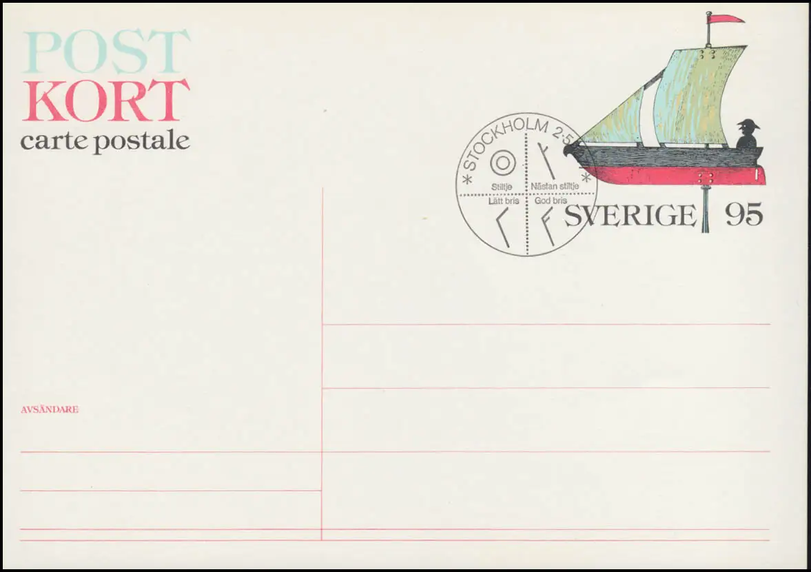 Suède Carte postale P 100 voilier 95 Öre 1977, FDC Stockholm 2.5.77