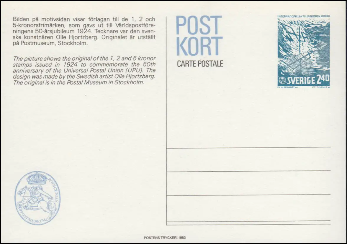 Suède Carte postale P 106 UIT Union internationale des télécommunications, ** frais de port